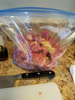 Season meat generously with salt and pepper and cut into chunks. I prefer the flavor of VSpicery Chophouse seasoning blend over traditional S&P.