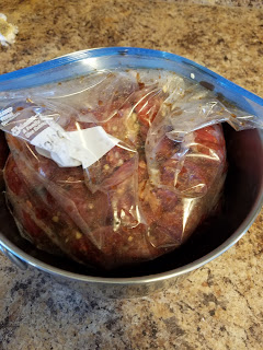 Cut meat into large chunks and season with S&P. Add to ziplock bag with remaining ingredients. Shake bag up to distribute marinade and spices. Let meat marinate for a few hours or overnight.